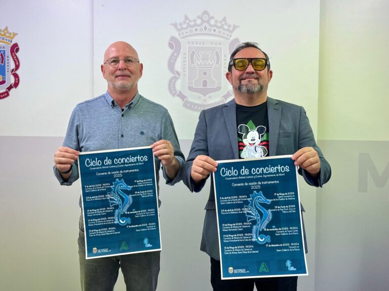 El concejal de Cultura del Ayuntamiento de Motril, Miguel Ángel Muñoz Pino, y el director del Conservatorio Profesional de Música «Antonio Lorenzo», Rafael López, han presentado hoy el ambicioso ‘Ciclo de Conciertos’ organizado conjuntamente entre ambas instituciones. Un proyecto cultural que, según han detallado, ya ha comenzado y se extenderá hasta final de año, con la intención de acercar la música al conjunto de la ciudadanía a través de escenarios repartidos por distintos espacios culturales de la ciudad.