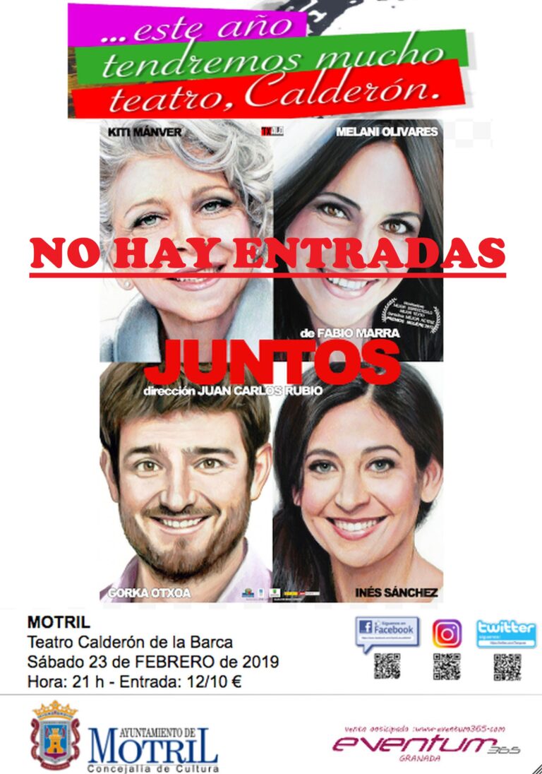 El concejal de Cultura, Francisco Ruiz, ha informado que la obra de teatro Juntos, de Fabio Marra, protagonizada por Melani Olivares, Gorka Oxoa, Kiti Mánver e Inés Sánchez, programada para este sábado 23 de febrero (21.00 horas) en el Calderón ha colgado el cartel de ‘No Hay Entradas’.