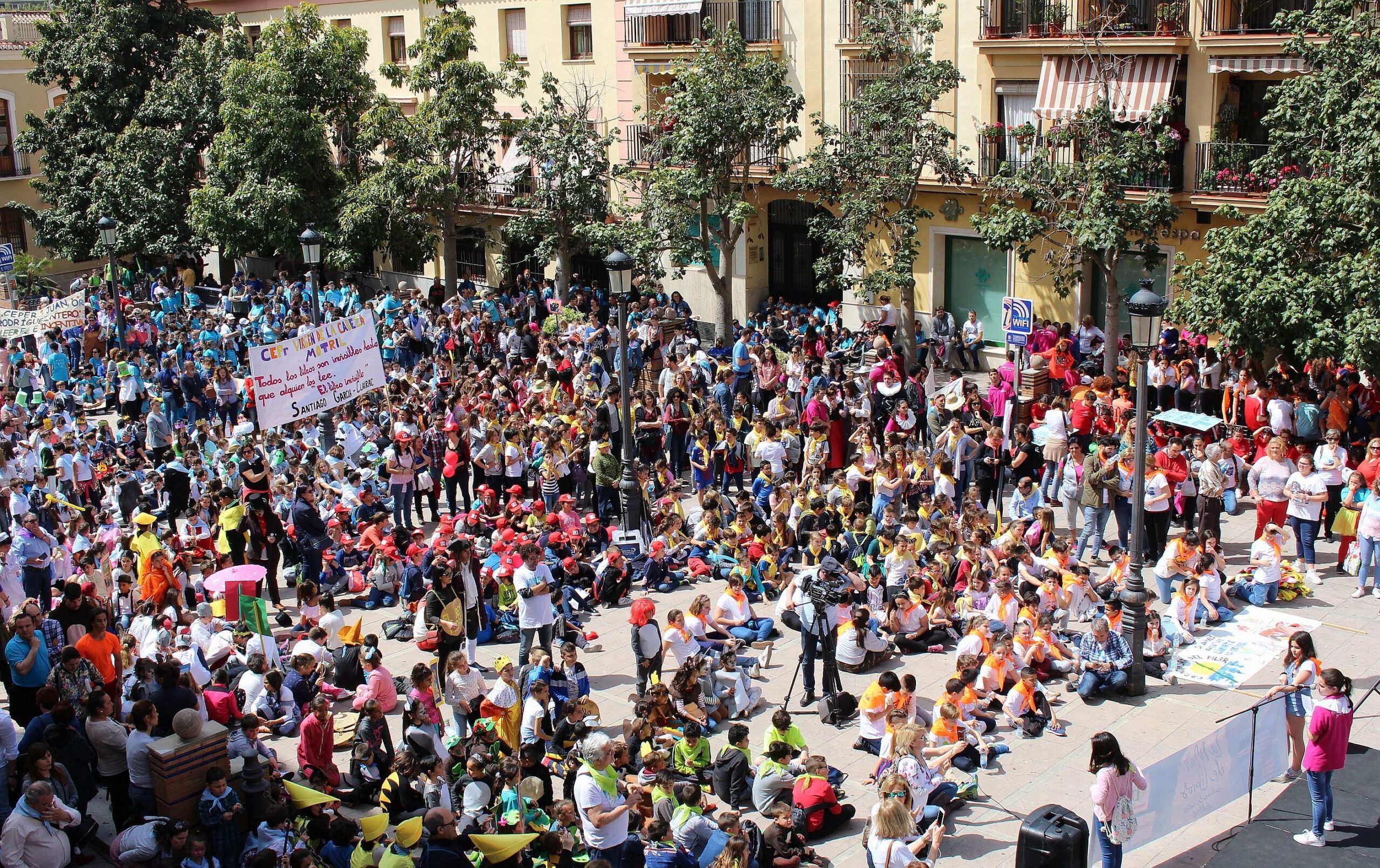 Más de un millar de estudiantes, ataviados con ropa de diferentes colores identificativos de cada uno de los centros educativos a los que pertenecen y acompañados por familiares y docentes, se han echado a la calle y han tomado edificios públicos como el Ayuntamiento, la Jefatura de Policía, el Hospital, residencias de mayores, la sede de Mancomunidad o la de la empresa Aguas y Servicios para leer a trabajadores y viandantes fragmentos de obras literarias de autores como Gloria Fuertes o García Lorca, entre otros muchos.