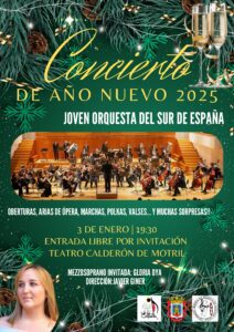 El concejal de Cultura del Ayuntamiento de Motril, Miguel Ángel Muñoz Pino, ha anunciado hoy en rueda de prensa el esperado Concierto de Año Nuevo 2025, que se celebrará el próximo 3 de enero a las 19:30 horas en el Teatro Calderón de Motril. La velada musical estará a cargo de la Joven Orquesta del Sur de España, bajo la batuta del director Javier Giner, y contará con la participación especial de la mezzosoprano Gloria Oya.