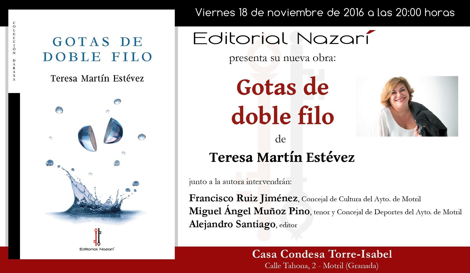 La poetisa motrileña siempre ha tenido la lectura como actividad vital e imprescindible, y, cómo no, dentro de ella, la poesía ocupa un lugar central. Ha publicado parte de sus poemas en las redes sociales y colaboró con su poemario-epílogo ‘Un Beso Más’ en la edición del libro ‘El Nudo de Mis Pasos’, de Gaspar Esteva Rodríguez (1954-2013). En la Casa de la Condesa de Torre Isabel presentará su nueva obra, ‘Gotas de Doble Filo’, editado por la editorial Nazarí.